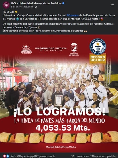 En conjunto con el Gobierno Municipal de Mexicali, Baja California, los alumnos de la Universidad Vizcaya de las Américas se encargaron de elaborar una rosca de 4 mil 53 metros, elaborada con 5 toneladas de harina, 87 litros de vainilla y 31 mil muñequitos, todo con el objetivo de alcanzar el récord.