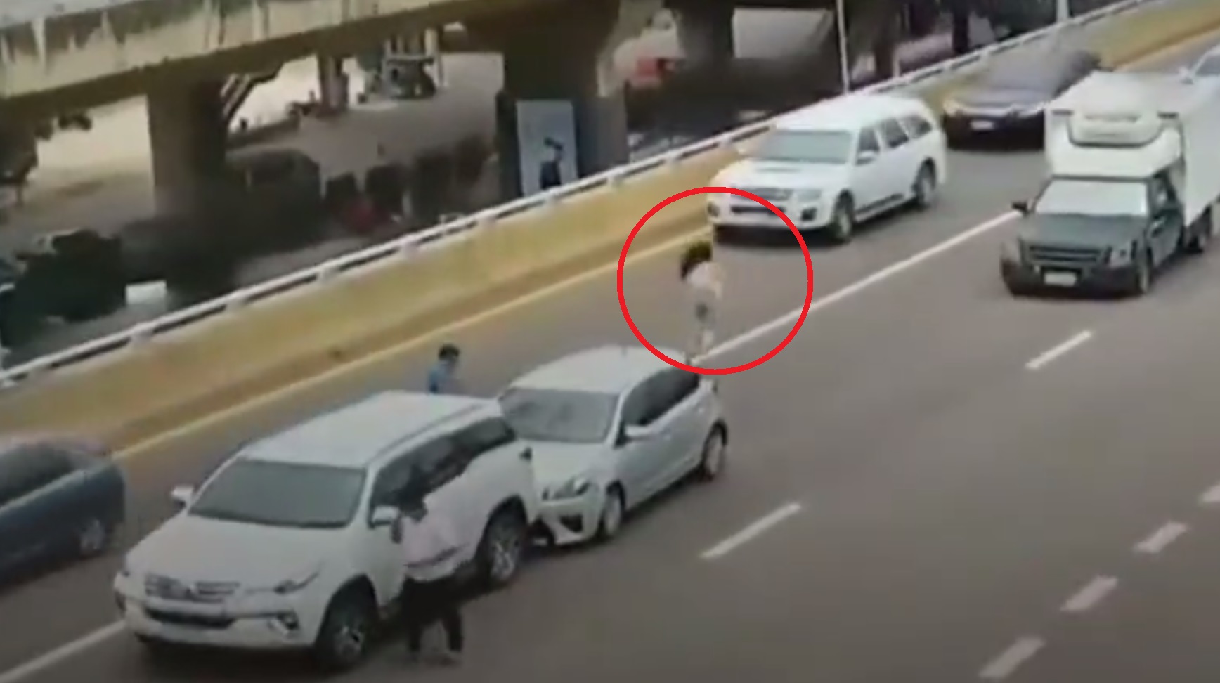 El video difundido en redes muestra a la mujer salir del carro para correr por la autopista antes de pedir ayuda al conductor de un vehículo color verde.