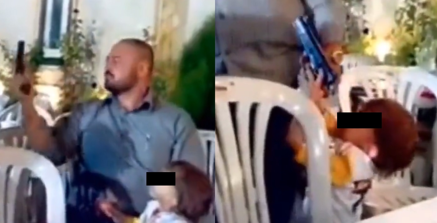 El video que ya acumula millones de reproducciones en redes, muestra a un hombre sosteniendo el arma de fuego en lo que parece ser una fiesta, mientras que a su lado se encuentra un pequeño niño.