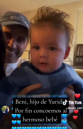 Alegre, el pequeño sonreía ante la emoción de sus padres, quienes coreaban: "Beni, Beni", mientras le hacían leves movimientos. Yuridia lo alentaba: "Diles hola", refiriéndose a los miles de seguidores que fueron espectadores y que comentaban con entusiasmo frases como "Está divino" y "Que hermosura de bebé".