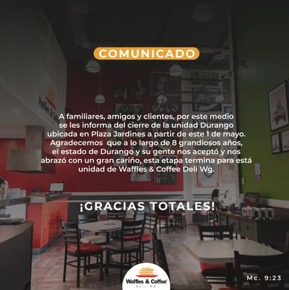 Hoy fue el turno del restaurante Waffles & Coffee Durango, el cual tras ocho años de haber abierto sus puertas y ser un punto de reunión para miles de comensales, anuncia que mañana, 30 de abril, dejará de prestar sus servicios.