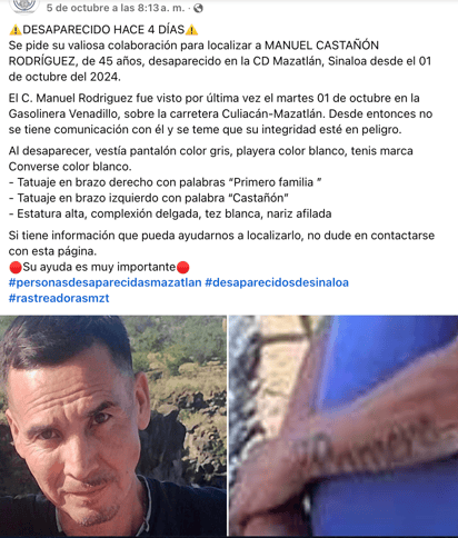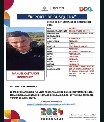 Responde al nombre de Manuel Castañón Rodríguez, tiene 44 años de edad y la última vez que se tuvo comunicación con él fue el 30 de septiembre del 2024.