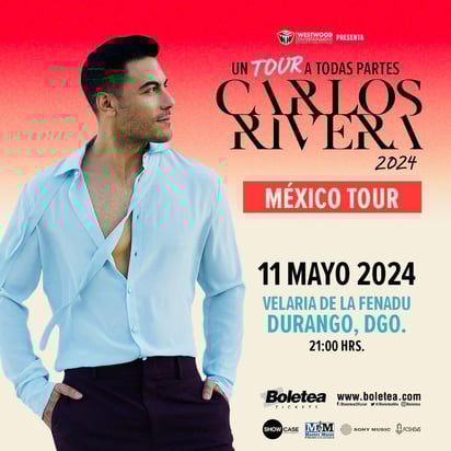 El cantante Carlos Rivera, reconocido por su talento y carisma, llegará con "Un Tour a Todas Partes" a la capital de Durango.