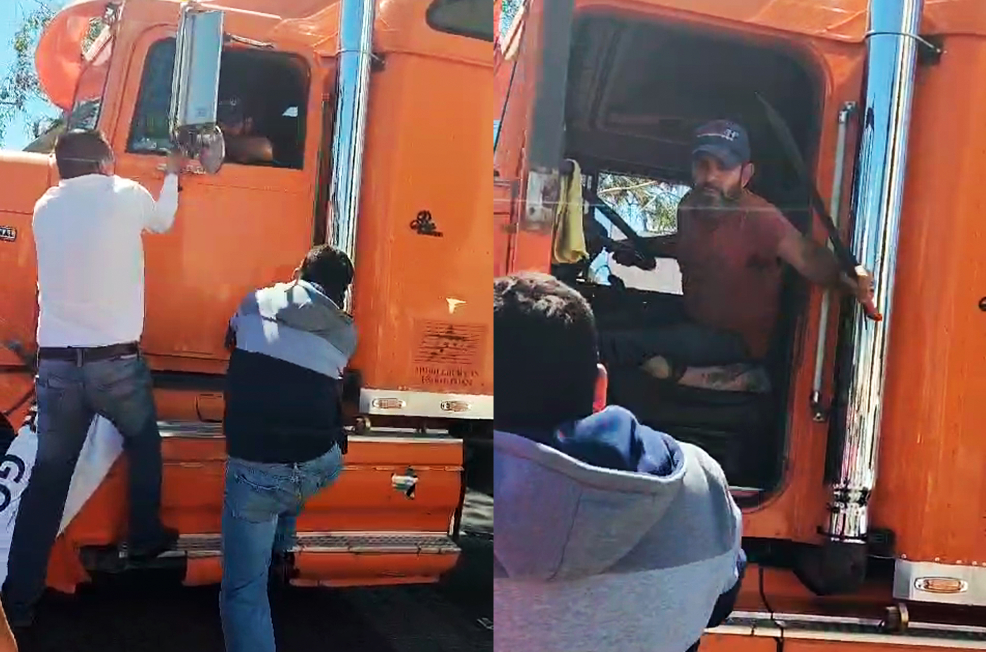 En el video se puede apreciar cómo los manifestantes tratan de impedir el paso del tráiler e incluso llegan a abrir la cabina del conductor para obligarlo a bajarse, motivo por el cual este saca un machete para amedrentar a la gente que se encontraba protestando.