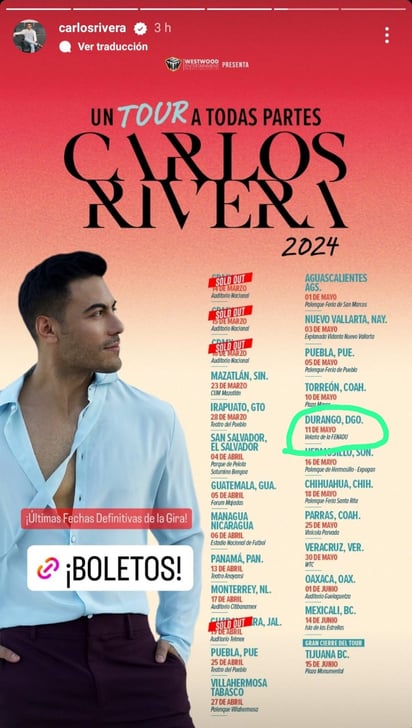 A través de la cuenta oficial de Instagram, el cantante Carlos Rivera confirmó esta tarde un concierto en la ciudad de Durango.