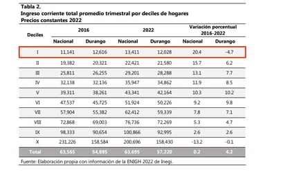 Además, el resumen de política elaborado por especialistas del Inevap indica que los ingresos de los hogares más pobres de Durango disminuyeron 4.7 por ciento de 2016 a 2022. A nivel nacional, en ese mismo lapso, aumentaron 20.4 por ciento.