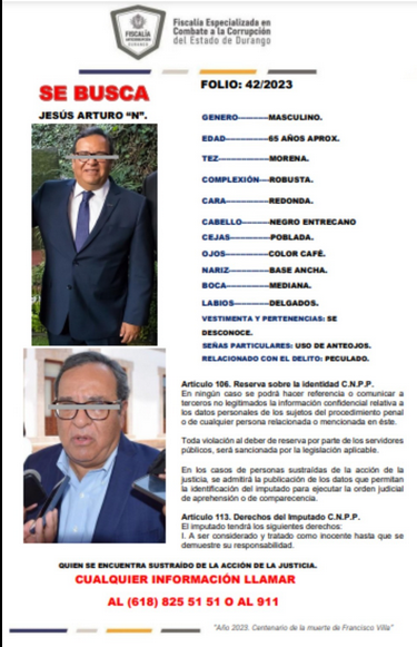 Jesús Arturo "N" está boletinado en las Fiscalías Generales o Procuradurías de Justicia de las 32 entidades del país, así como en la Fiscalía General de la República.