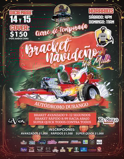 En busca de volver a presentar emoción y acción automotriz de gran calidad, el Bracket Navideño dará banderazo en el Autódromo de Durango este próximo sábado 14 a las 16:00 horas y el domingo 15 de diciembre a las 11:00 horas, esto con el fin de mostrar el cierre de temporada con los impresionantes arrancones 1/8 de milla.