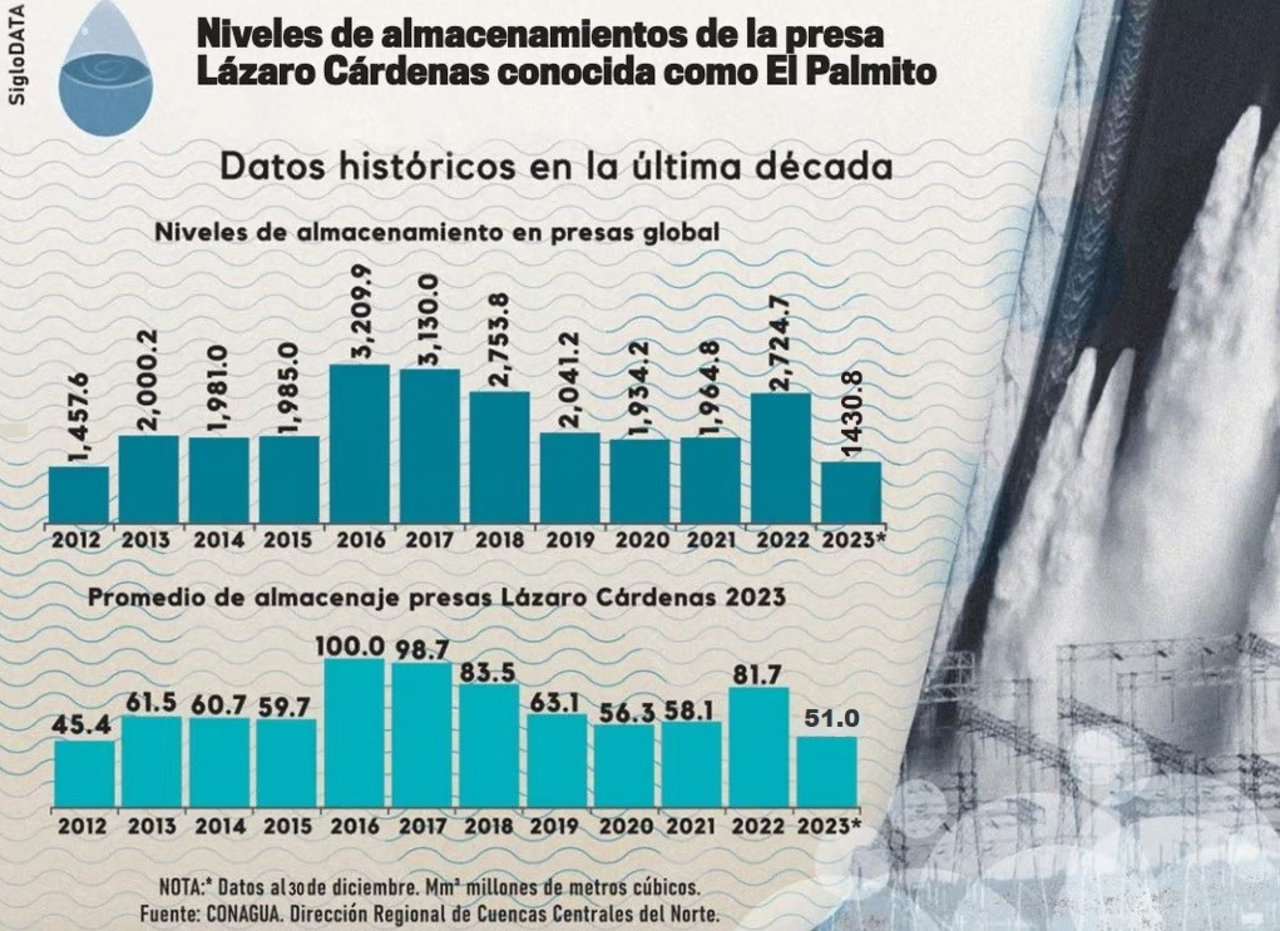 El Palmito. Esta infografía muestra como han sido los niveles de almacenamiento de la presa más grande del estado desde el 2012 que ha sido el nivel más bajo de este siglo.