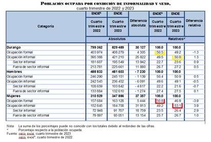 La Encuesta Nacional de Ocupación y Empleo que se realizó en Durango para el cuarto trimestre del año 2023, revelan que son más mujeres las que laboran dentro de la informalidad, el cual aumentó en el 2023.