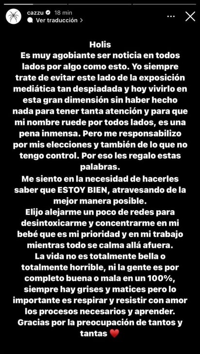 "Yo siempre traté de evitar este lado de la exposición mediática tan despiadada y vivirlo si haber hecho nada para tener tanta atención, es una pena", inicia el texto compartido en sus historias de Instagram.