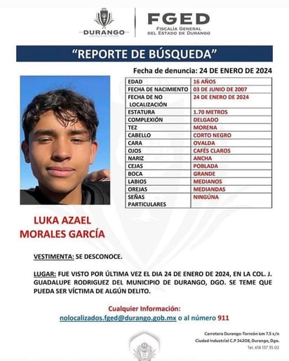 De inmediato fue reportado como desaparecido y la Fiscalía General del Estado emitió una ficha de búsqueda, en donde se especifica que su última ubicación fue al salir de su casa, en la colonia J. Guadalupe Rodríguez, de la capital duranguense.
