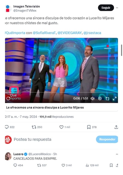 "Además se la van a pelar porque vamos a seguir haciendo los mismos chistes que se nos den la gana, ya no de las personas que se quejaron, nunca más los volveremos a mencionar. Así que, si usted entra a Twitter y ven tendencia a Lucerito es gracias a nosotros. Hicimos unos pinches chistes y ya, ni siquiera estuvieron así de gachos".