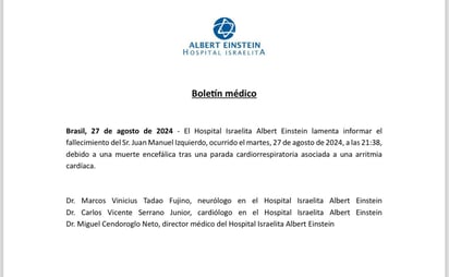 “El Hospital Israelita Albert Einstein lamenta informar el fallecimiento del Sr. Juan Manuel Izquierdo, ocurrido el martes, 27 de agosto de 2024, a las 21:38, debido a una muerte encefálica tras una parada cardiorrespiratoria asociada a una arritmia cardíaca”, se leía en el último boletín emitido.