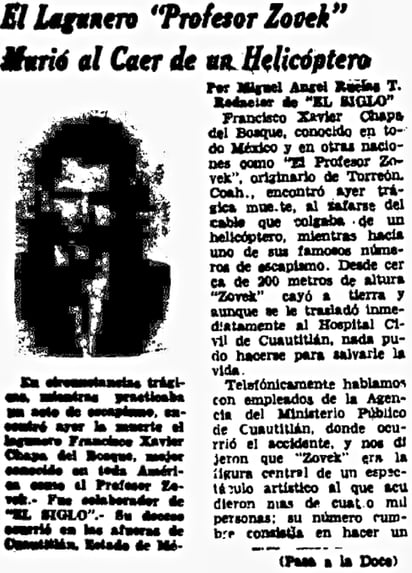 “Francisco Xavier Chapa del Bosque, conocido en todo México y en otras naciones como El Profesor Zovek, originario de Torreón, Coahuila encontró ayer una trágica muerte al zafarse del cable que colgaba de un helicóptero mientras hacía uno de sus famosos números de escapismo.