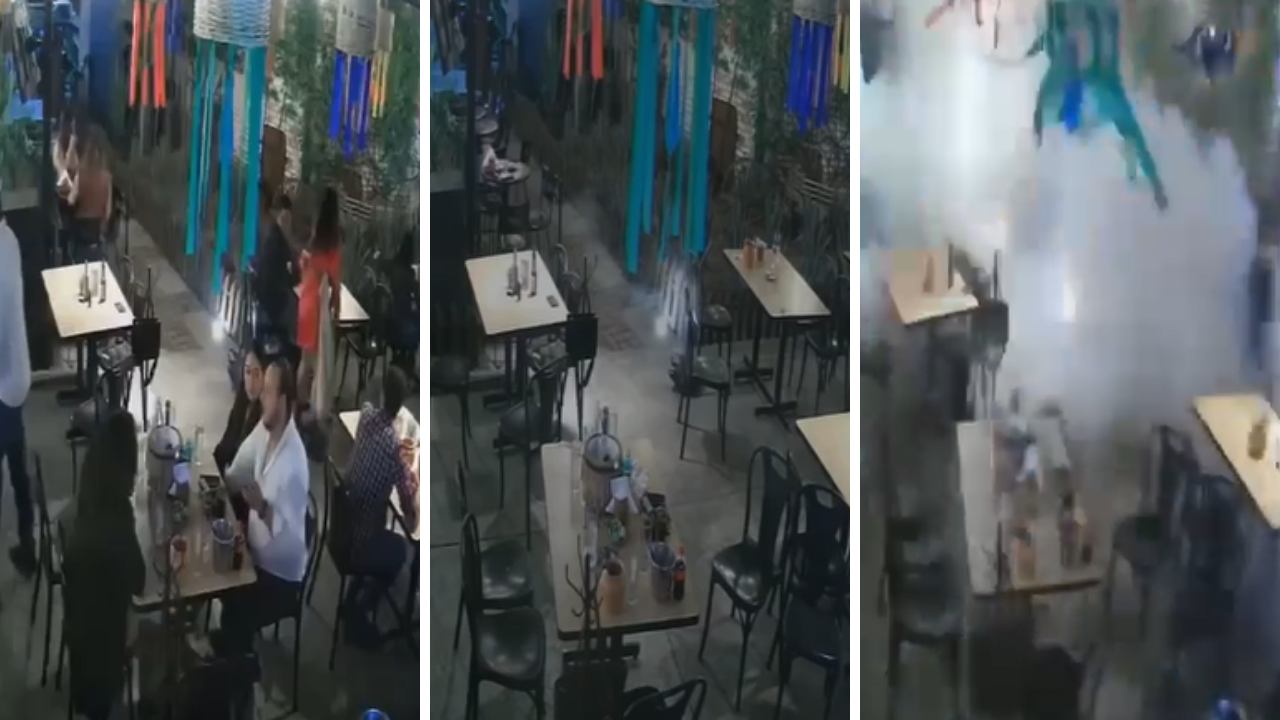 Las imágenes del momento exacto en que lanzaron una granada al interior de un restaurante se han vuelto virales en redes sociales.