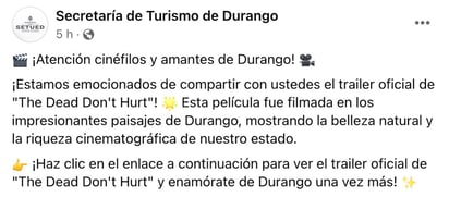 Al ser filmada en Durango, la propia Secretaría de Turismo del Estado publicó el tráiler en su página oficial, en donde se señaló la emoción de la llegada a cines de este proyecto. “¡Estamos emocionados de compartir con ustedes el trailer oficial de ‘The Dead Don’t Hurt!’. Esta película fue filmada en los impresionantes paisajes de Durango, mostrando la belleza natural y la riqueza cinematográfica de nuestro estado”, se lee en la publicación de Facebook.
