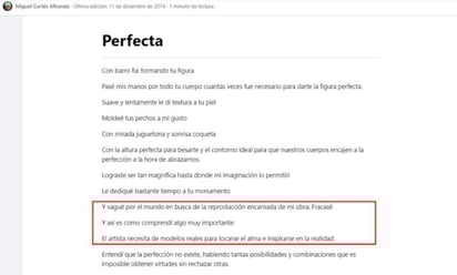 En el poema de “Perfecta” hace alusión a una supuesta escultura de barro hecha a mano en la que busca representar a una mujer; sin embargo, resalta la parte final del mismo, en el que escribe: “ Y vagué por el mundo en busca de la reproducción encarnada de mi obra. Fracasé. Y así es como comprendí algo muy importante: El artista necesita de modelos reales para tocarse el alma e inspirarse en la realidad”.