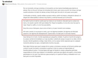 El poema “Te Extrañaré”, aparece un verso que dice: “Hace tiempo te vi morir, moriste sepultada por pequeños cristales.