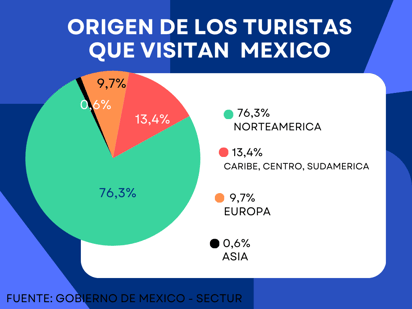 El análisis regional de la llegada de pasajeros revela que un abrumador 76.3% provino de Norteamérica, seguido por viajeros de Caribe, Centro y Sudamérica (13.4%), Europa (9.7%) y Asia (0.6%). Es muy grande la diversidad de visitantes que México continúa atrayendo, fortaleciendo lazos culturales y económicos con diversas regiones del mundo.