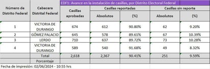El Instituto Electoral y de Participación Ciudadana del Estado de Durango (IEPC) confirma que, a las 10:00 horas, ya se tiene instalado el 72 por cierto de las casillas, es decir, mil 890.