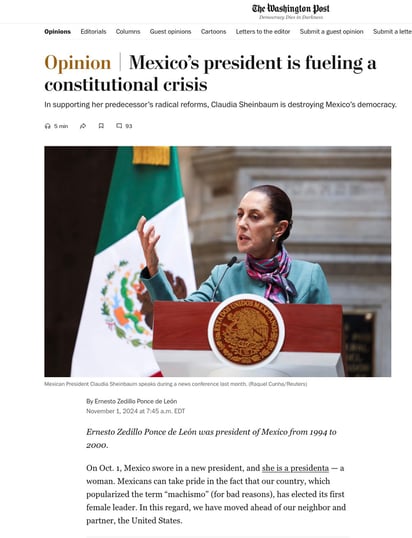 “Su intención es transformar el régimen político de México en uno autoritario", sostuvo y abundó que el nuevo gobierno, encabezado por Sheinbaum, “ha redoblado su apoyo al plan antidemocrático de AMLO", incluso “abogando porque el gobierno ignore los fallos judiciales”.