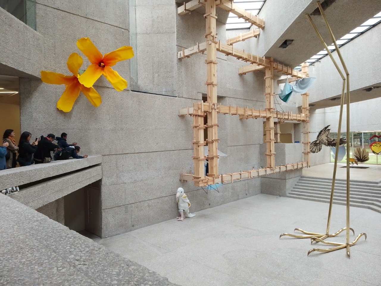 Su casa invade desde la sala 1 hasta el patio, apropiándose de la arquitectura del espacio museístico, en el que convive con figuras de gran formato, aves y animales migratorios. Destacan las enormes y largas patas metálicas doradas de garza que se levantan hasta el techo mismo del recinto, o algunas de menor tamaño con un par de hermosas y ligeras plumas, así como las flores gigantes que elaboró con su pareja Álvaro Urbano, artista español, que presentaron en el Palacio de Cristal, en Madrid y ahora en este contexto en el que se logra una unidad armoniosa con varias series de su obra realizada en al menos década y media de trayectoria, agregó la curadora asistente del museo.