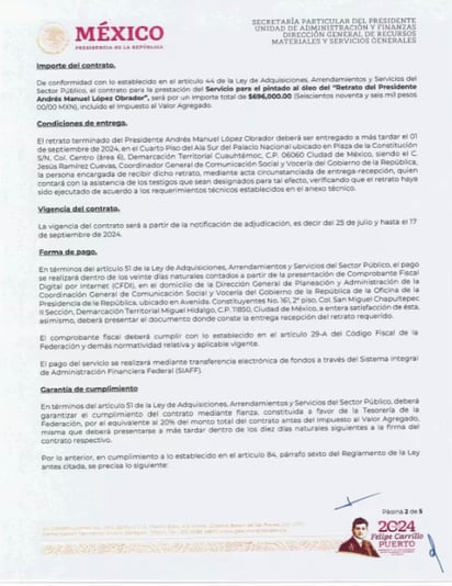 El contrato establece que el retrato deberá realizarse una pintora al óleo de cuerpo completo, en donde la figura del presidente López Obrador sea protagonista, pero rodeado de elementos de valor simbólico, que, en conjunto, genera una visión más amplia de este.