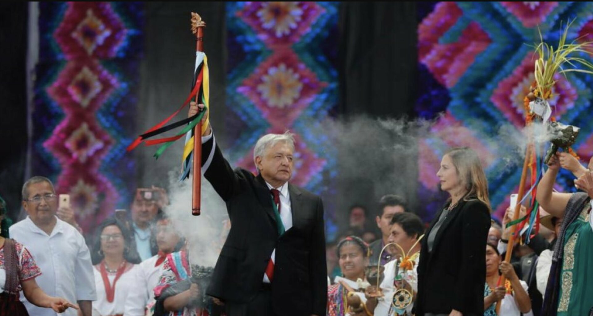 El retrato se añade, deberá incorporar con singular énfasis la importancia del bastón de mando como símbolo del compromiso adquirido por el Presidente con las comunidades indígenas y pueblos autóctonos, como la responsabilidad que estos pusieron en él al reconocerlo como su gobernante; aunado a lo anterior, deberá de incorporarse la idea simbólica de que el Presidente se encuentre acompañado por la gente de México”.