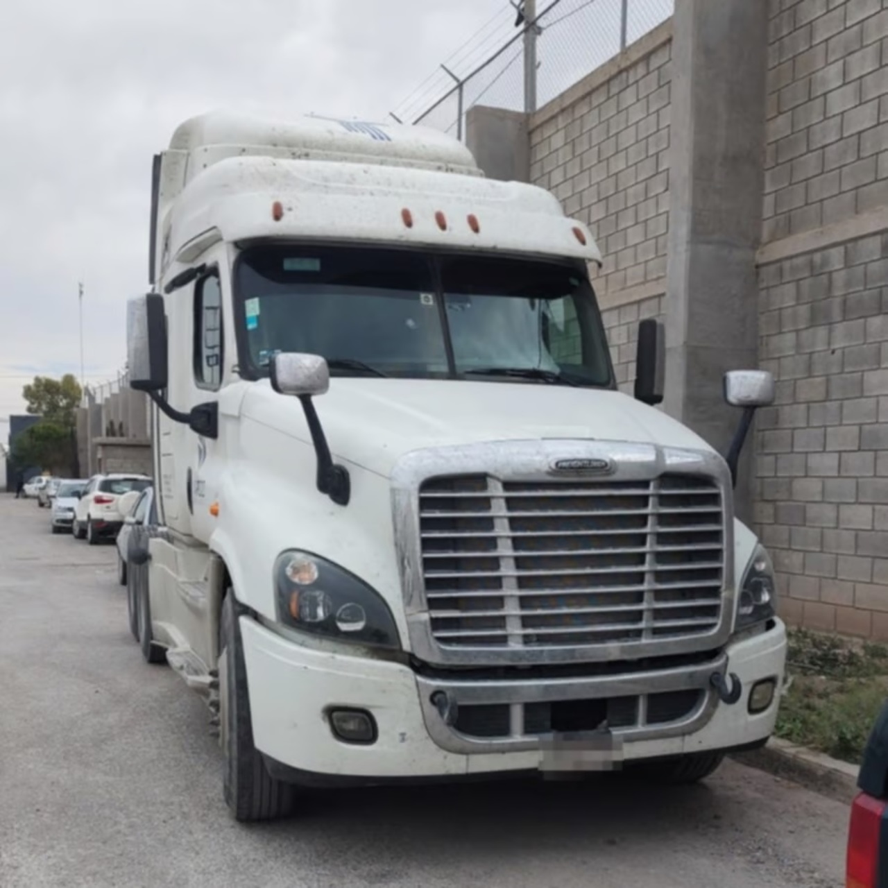 Se trata de un tractocamión de la marca Freightliner, color blanco, con un semirremolque tipo caja seca, también en color blanco, con número económico YL-042.