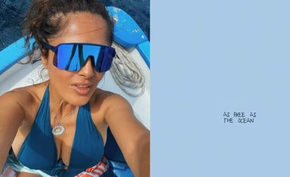 Salma Hayek compartió una selfie en la que luce un traje de baño liso, de color azul clásico, con escote halter y con un original nudo a la altura del pecho. Este color fue el protagonista de su look. La actriz de Frida decidió llevar unos lentes de sol deportivos en el mismo tono, impulsando el "total blue" en la playa.