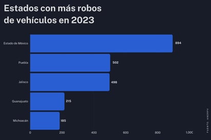 De igual manera, la Anerpv comunicó que hubo un total de 540 reportes de robo de vehículos ligeros en el Estado de México, con 133 casos, Jalisco con 103, Puebla con 67, Michoacán con 57 y Guanajuato con 29.