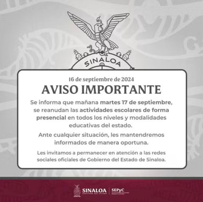 El comunicado señala que mañana, 17 de septiembre, se reanudan las actividades escolares presenciales de todas las modalidades y niveles educativos.