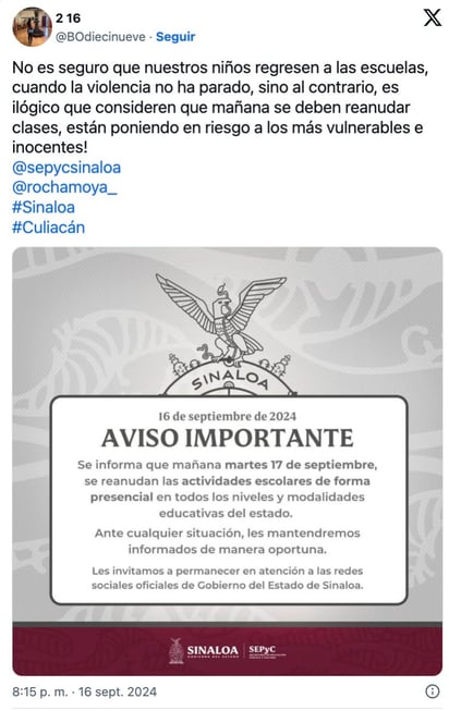 La Secretaría de Educación Pública y Cultura (SEPyC) de Sinaloa, lanzó un comunicado a través de su cuenta de X, antes Twitter.