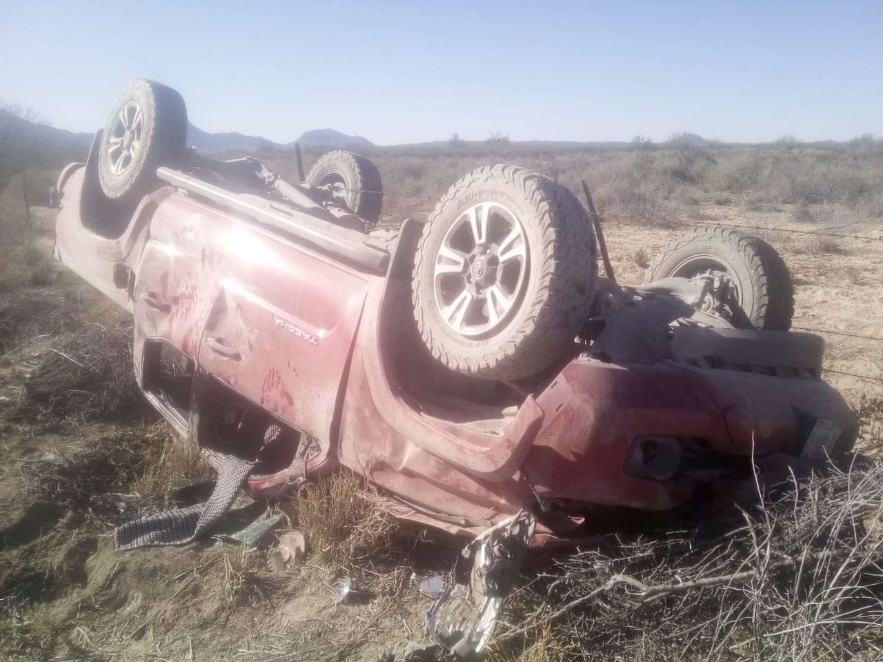Presuntamente la camioneta sufrió una falla mecánica y los frenos no respondieron, por lo que se salió del camino y dio varios giros hasta terminar sobre el toldo entre los matorrales.