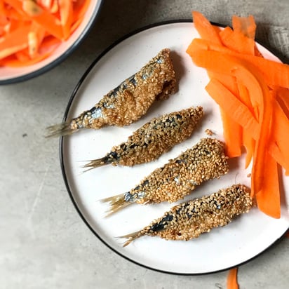 4. Sardinas a la plancha con crema de calabaza, zanahoria, puerro y ajo