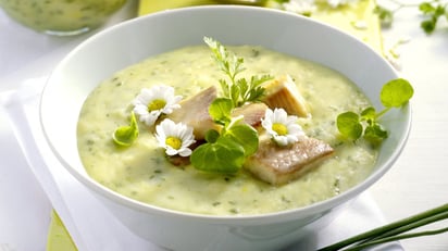 6. Crema de calabacín con bolitas de queso fresco y trucha en papillote con jamón