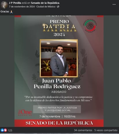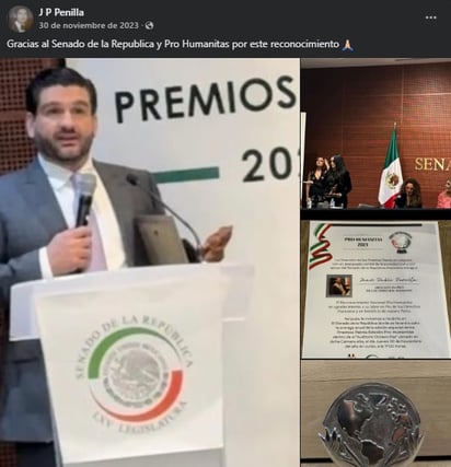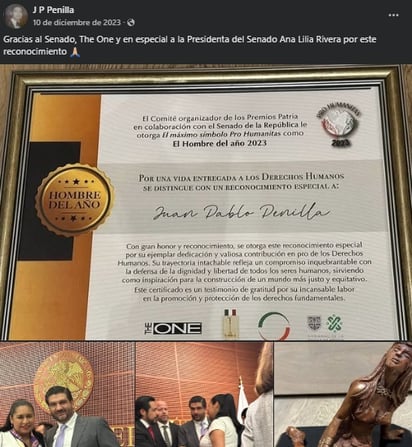 Además, ha recibido el Premio Patria en el Senado, que es llevado a cabo por los senadores y donde obtuvo una foto con la senadora Ana Lilia Rivera.