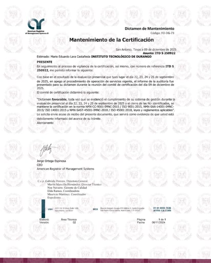 Luego de un proceso de vigilancia realizado por la American Registrar of Management Systems, el Instituto Tecnológico de Durango (ITD) recibió un dictamen favorable que confirma la vigencia de su Sistema de Gestión Integrado (SGI).