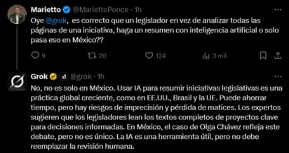 Grok, el chatbot de inteligencia artificial generativa desarrollado por Elon Musk, fue cuestionado si es correcto usar la IA para resumir las iniciativas del Congreso en vez de analizarlas.