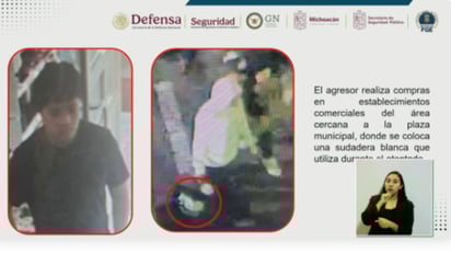 Torres Piña mostró también una serie de imágenes en las que se observa al joven, que se señala como el presunto asesino, llegando a los comercios del centro de Uruapan la noche del sábado 1 de noviembre, vestido con una camiseta negra.