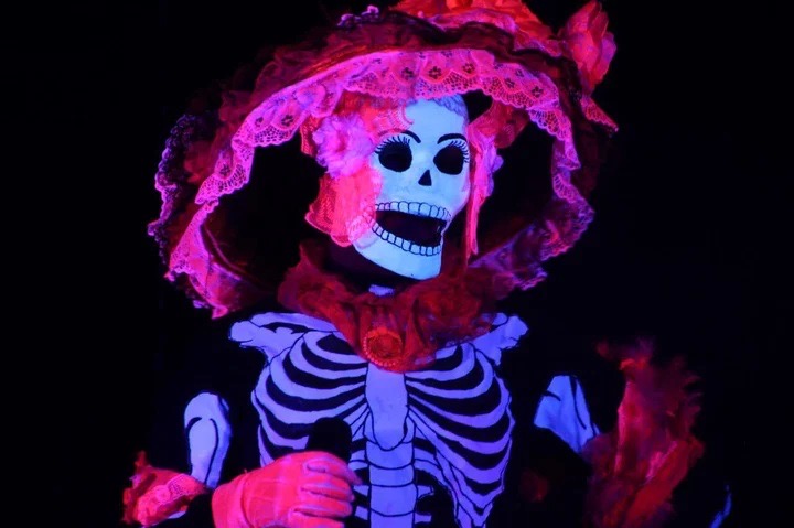 El montaje revive el espíritu del Día de Muertos con personajes como la Catrina y las calaveras danzantes, envueltos en luces neón, efectos visuales y coreografías llenas de energía.