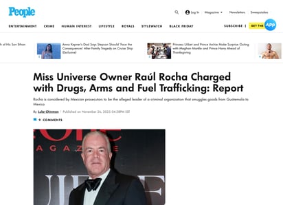 People, en una de las primeras notas en inglés, resumió el caso destacando que Rocha Cantú enfrenta cargos por “tráfico de drogas, armas y combustible”, retomando información de la autoridad mexicana y subrayando su papel como propietario de Miss Universe Organization.