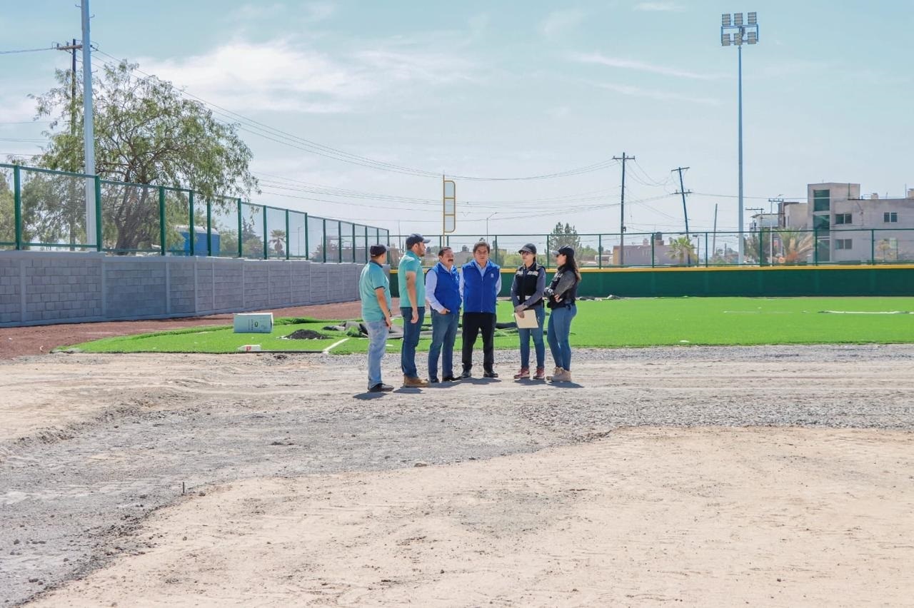 La renovación de este espacio, que representa una inversión de alrededor de 18 millones de pesos al deporte, incluye pasto sintético, gradas y sombra, bardas, dugouts, torres de iluminación, baños, plazoleta, área administrativa y bardas perimetrales, explicó Javier Chávez Cibrián, titular de Obras Públicas Municipales.