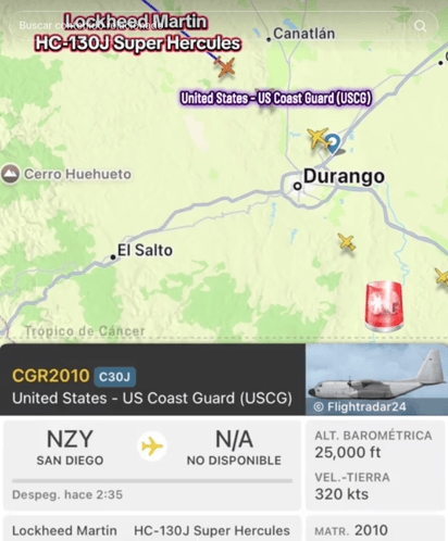 De acuerdo a la información que comparte el usuario, obtenida desde el sitio web Flightradar24, que recopila información de rastreo de vuelos en tiempo real, la aeronave habría sobrevolado la sierra de Durango y parte de Sinaloa, haciendo un recorrido en círculo para después dirigirse hacia Ensenada, Baja California, y de ahí hacia el estado de California, en Estados Unidos.