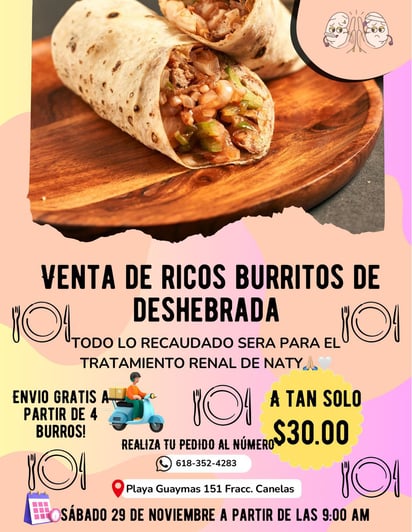 La venta de burritos se realizará este sábado 29 de noviembre a partir de las 09:00 horas, en calle Playa Guaymas No. 151, en el fraccionamiento Canelas, de la ciudad de Durango.
