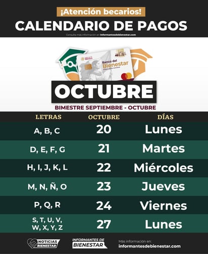 De acuerdo con la información compartida, este lunes 20 de octubre reciben depósito las letras "A", "B" y "C".