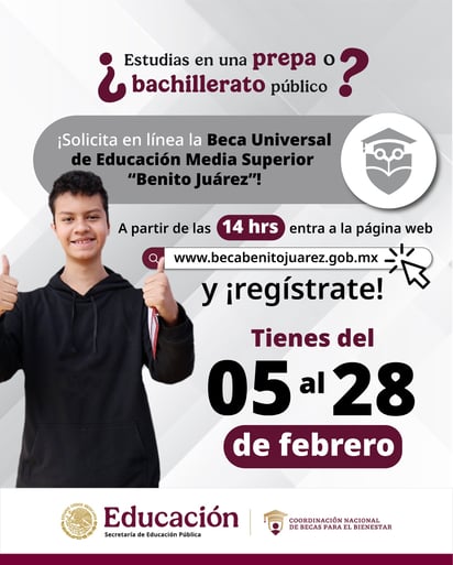Será a partir de las 14:00 horas cuando se habilitará el registro a través del sitio web oficial www.becabenitojuarez.gob.mx, que estará disponible para inscripciones hasta el último día del mes de febrero, el viernes 28.