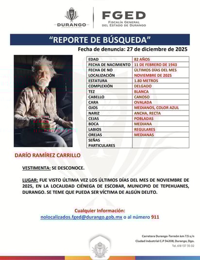 Darío Ramírez Carrillo, de 82 años de edad, fue visto por última vez los últimos días de noviembre en la localidad de Ciénega de Escobar, perteneciente al municipio de Tepehuanes.