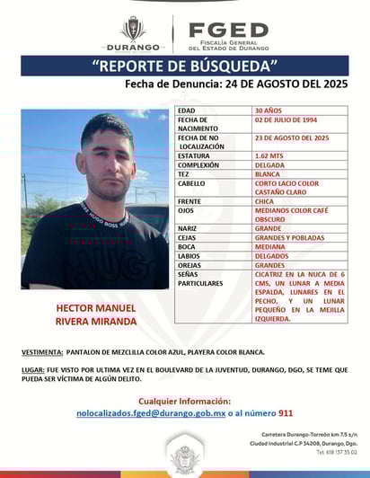 De acuerdo al reporte de búsqueda, Héctor Manuel Rivera Miranda, de 31 años de edad, con fecha de nacimiento el 2 de julio de 1994, fue visto por última vez el pasado sábado 23 de agosto en el bulevar De la Juventud, en Durango capital.